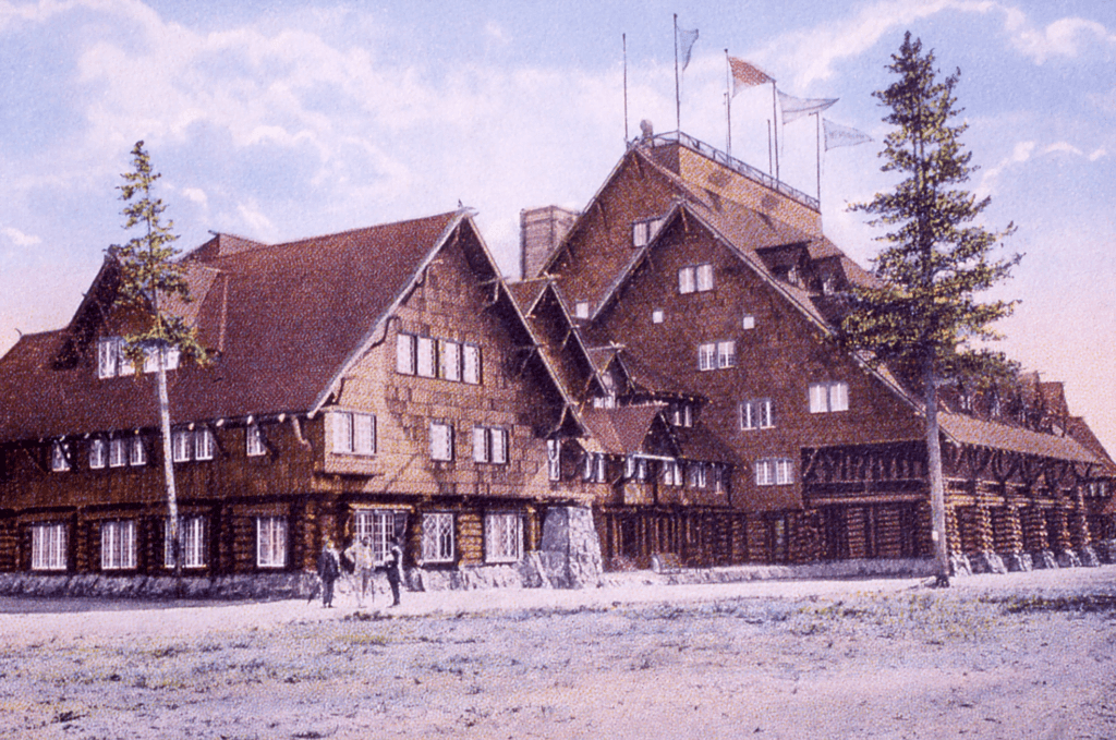 Built on the same location as the Upper Geyser Basin Hotel that burned down, the “Old House” of Old Faithful Inn was the first structure erected in 1903, with more additions being added to keep up with the increased demand for lodging in Yellowstone National Park. The interior of the structure contains four stories of balconies and a chimney and “crow’s nest” centered in the mammoth room.